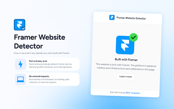 Framer Website Detector là một tiện ích mở rộng miễn phí cho Chrome được thiết kế để nhanh chóng xác định các trang web được xây dựng bằng nền tảng Framer. Công cụ này tự động quét từng tab, cung cấp cập nhật theo thời gian thực thông qua một biểu tượng trên thanh công cụ cho biết liệu một trang web có được hỗ trợ bởi Framer hay không. Người dùng có thể dễ dàng xác nhận sự hiện diện của các tài sản và thuộc tính cụ thể của Framer, nhận được một phán quyết rõ ràng về việc một trang web có được xây dựng bằng Framer hay không.